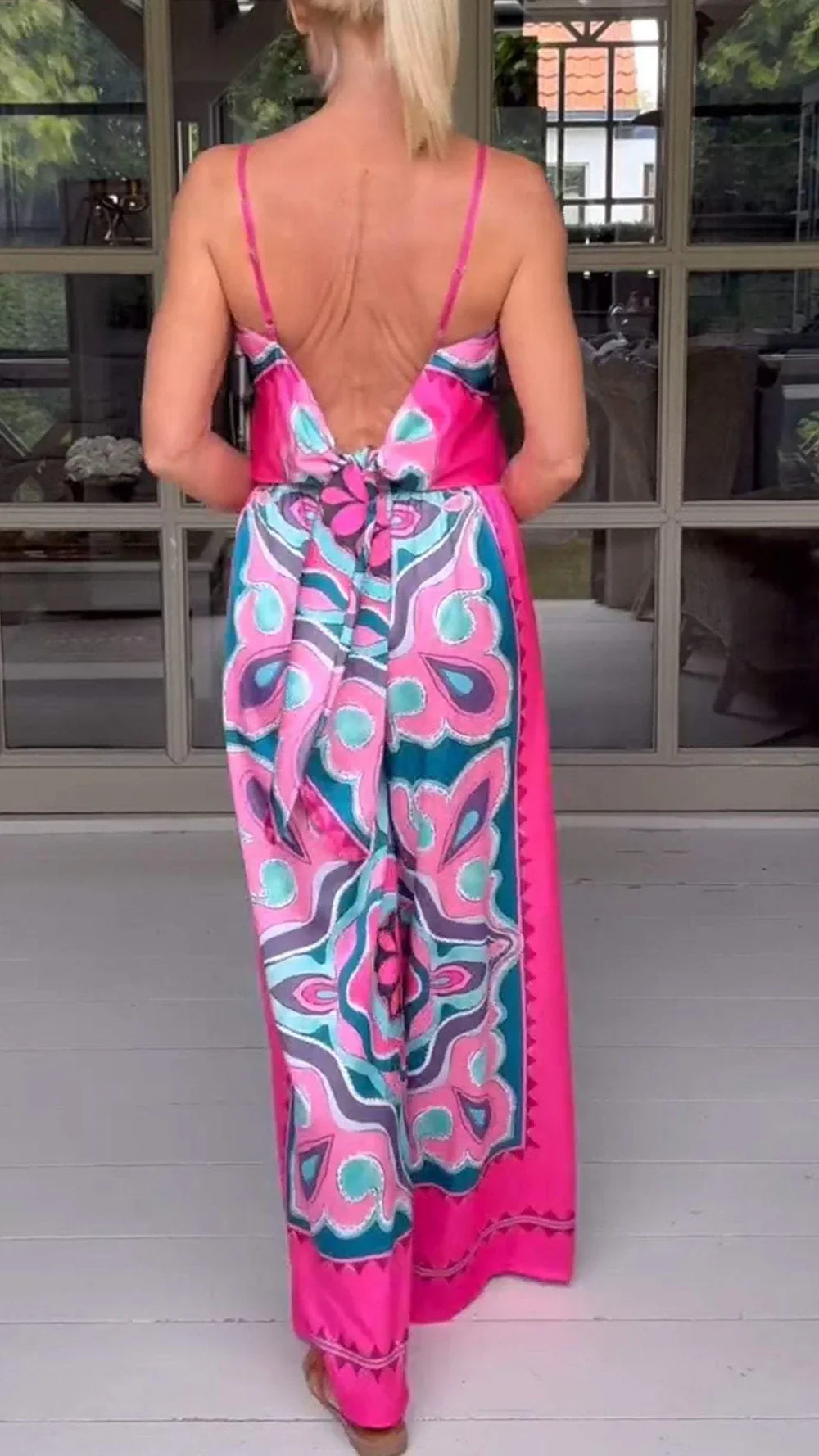 Dieses leuchtende zweiteilige Set besteht aus seidigem, leichtem Stoff, der mit auffälligen Prints verziert ist und sich perfekt für einen Auftritt eignet. Das fließende Oberteil mit Spaghettiträgern hat einen mehrlagigen, asymmetrischen Saum für zusätzliche Dimensionen, während die Hose mit weitem Bein eine luftige, entspannte Passform für ganztägigen Komfort bietet.