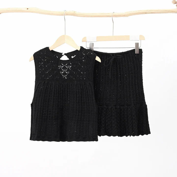 Amari präsentiert das Zweiteilige Set aus gehäkelter Baumwolle, ein stilvolles zweiteiliges Set aus gehäkelter Baumwolle. Dieses Set vereint Komfort und Eleganz, perfekt für warmes Wetter und bietet einen einzigartigen, handgefertigten Look, der in jeder legeren oder schicken Umgebung auffällt.