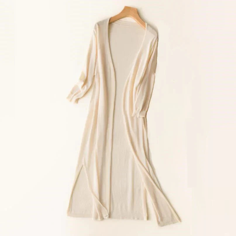 Asra – Eine lange Strick-Pullover-Jacke, die Gemütlichkeit und Stil verbindet. Perfekt für kühle Tage, bietet sie eine lässige Eleganz und wohlige Wärme.