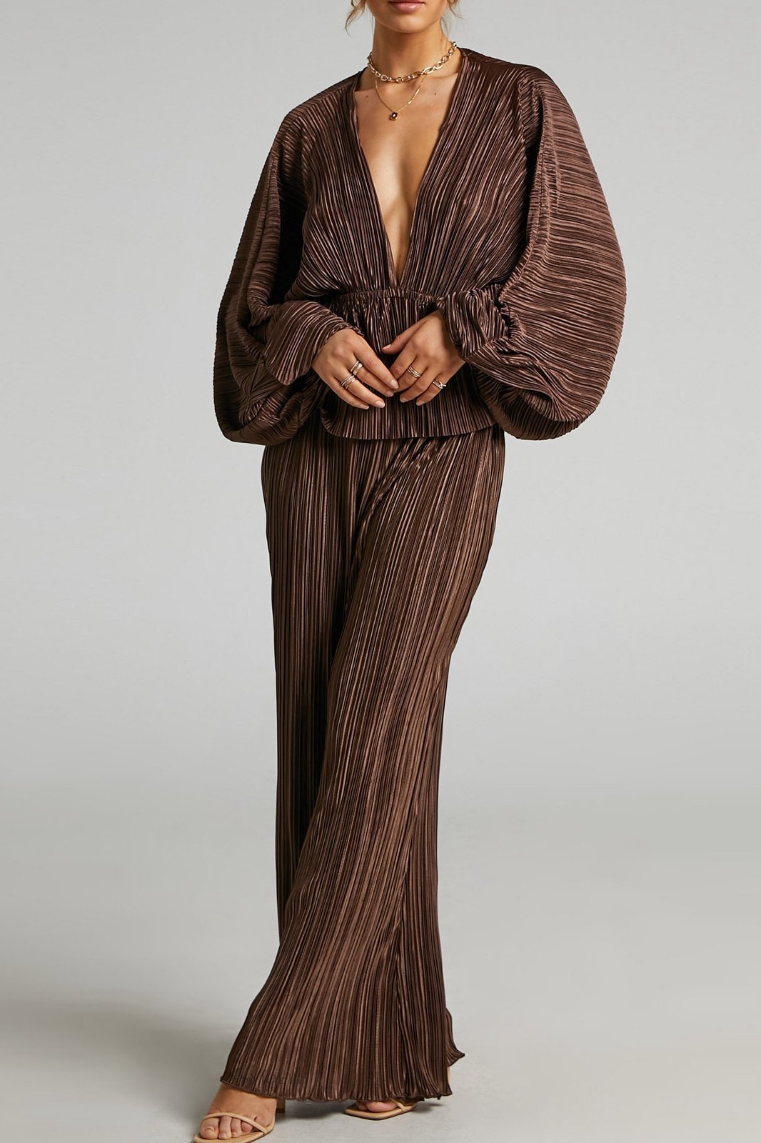 - Tiefer V-Ausschnitt: Der ausgeprägte V-Ausschnitt verleiht dem Ensemble eine sinnliche Note und hebt das Dekolleté gekonnt hervor.