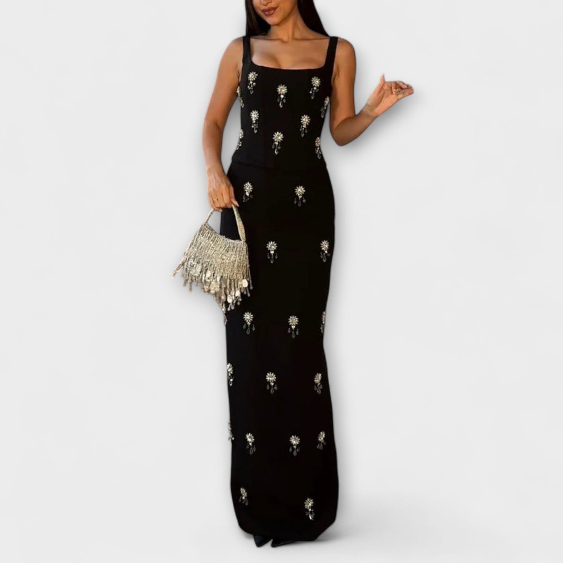Aviane – Schwarzes Ensemble mit Perlen-Zipper-Top und Rock