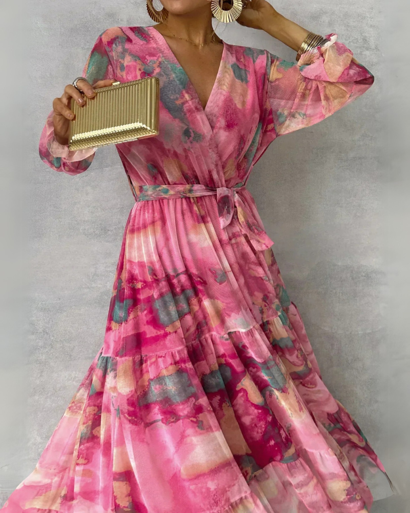 Dieses Damen-Maxikleid überzeugt mit einer eleganten Wickeloptik, einem tiefen V-Ausschnitt und langen Ärmeln. Die verstellbare Taillenschleife sorgt für eine perfekte Passform, während der fließende, stufenförmige Maxirock eine feminine Silhouette schafft. Das stilvolle Blumenmuster macht es ideal für Hochzeiten, Gartenpartys, Urlaub oder besondere Anlässe.