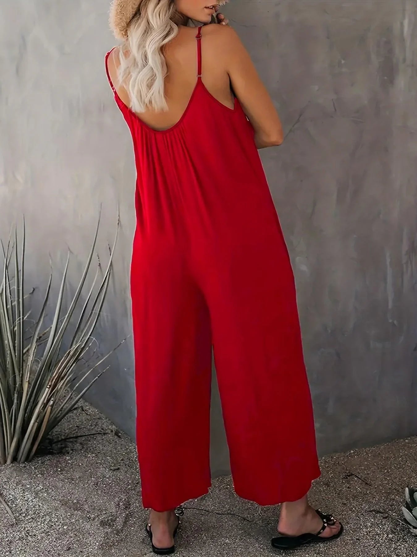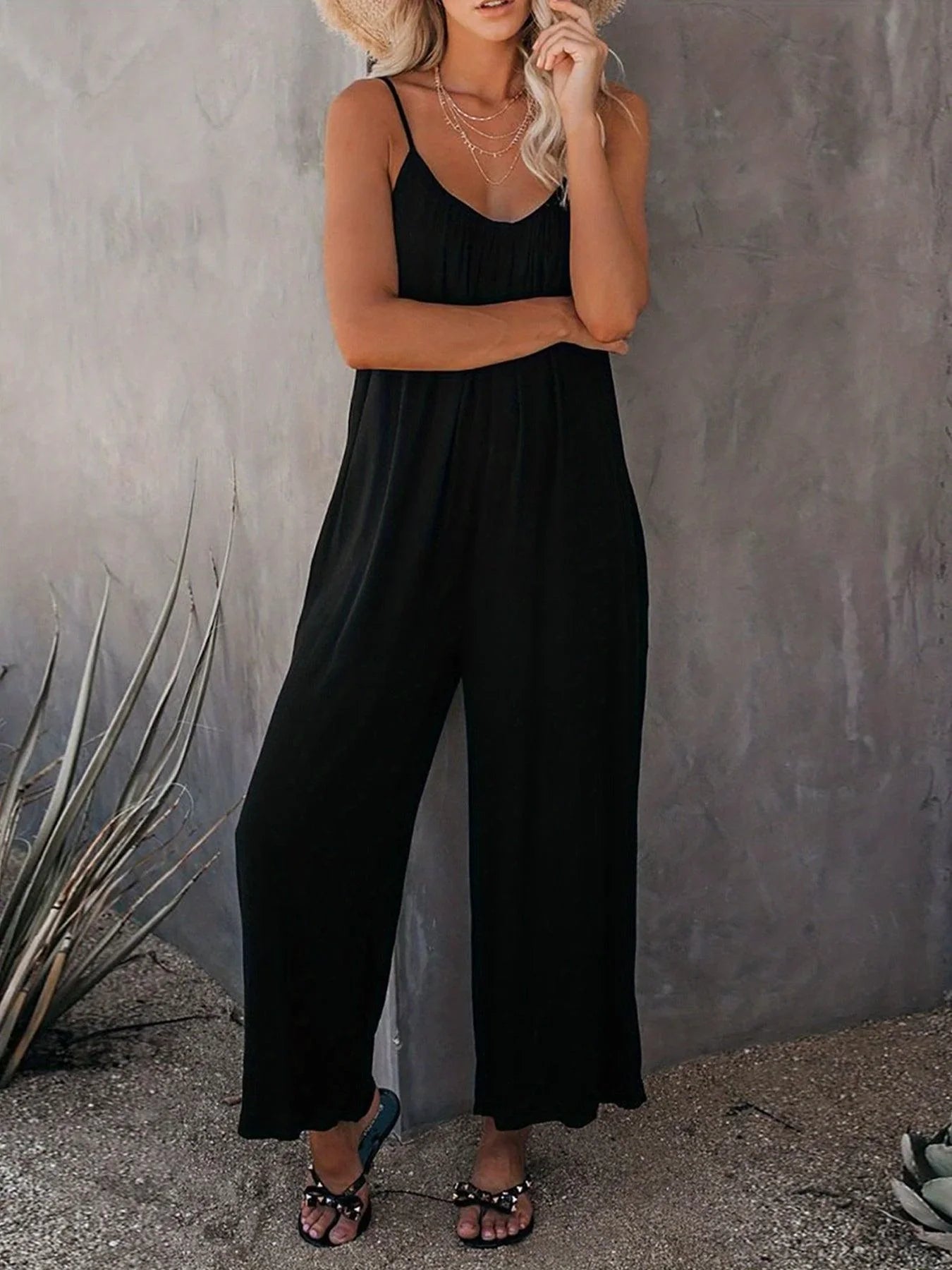 Dieser ärmellose Jumpsuit mit weitem Bein ist aus einer weichen, atmungsaktiven Mischung aus hochwertigem Stoff und Elasthan gefertigt und bietet ein leichtes und fließendes Tragegefühl, das perfekt für warmes Wetter ist. Die verstellbaren Spaghettiträger und die lockere Passform sorgen für ganztägigen Komfort und Bewegungsfreiheit.