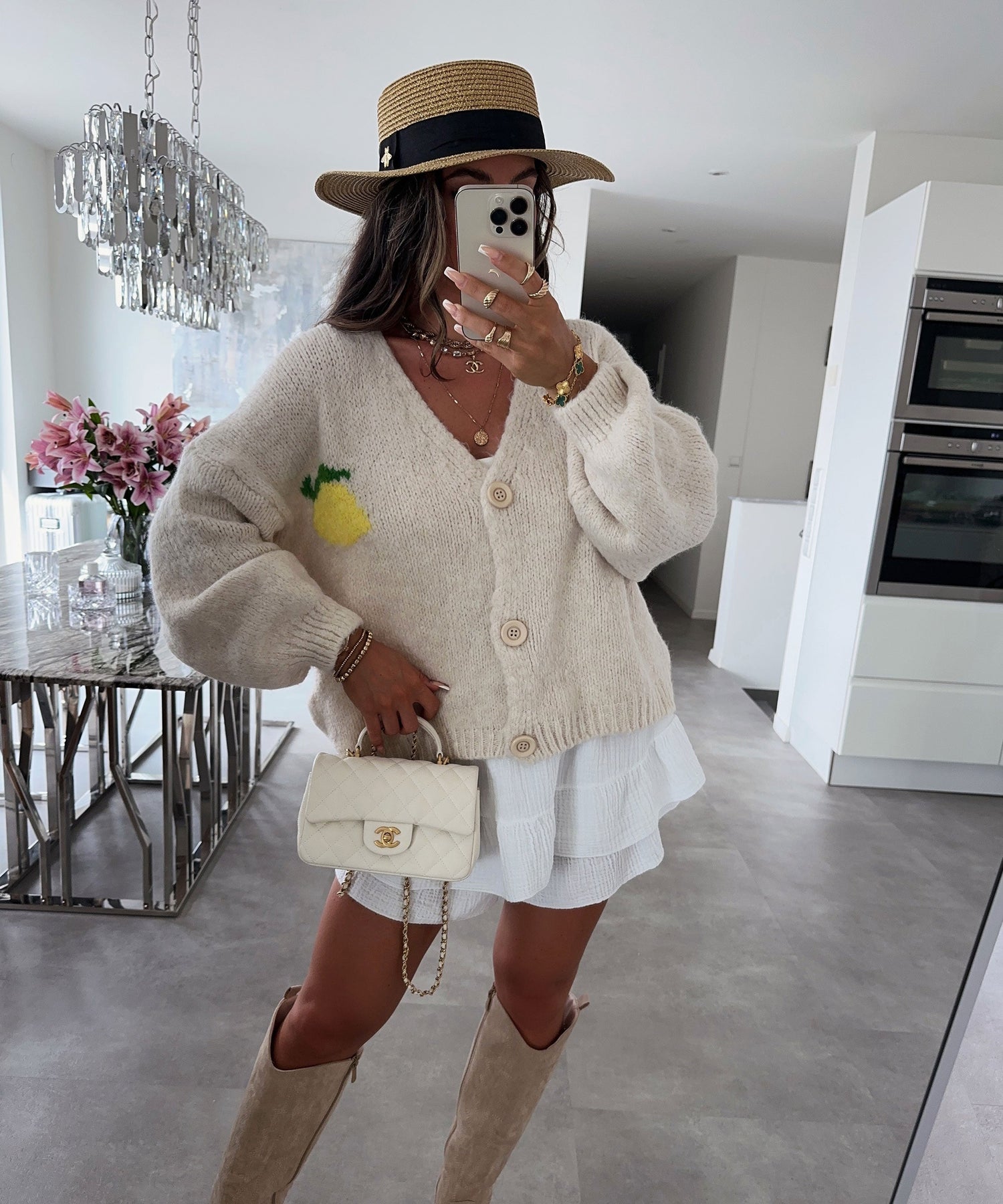 Dieser kuschelige cardigan bringt italienisches flair direkt in deinen alltag. das auffällige limoncello-muster auf der rückseite kombiniert spielerischen charme mit modernem style. die lockere passform, weiche strickqualität und die lässigen laternenärmel machen ihn zum perfekten begleiter für gemütliche stunden oder trendige streetstyle-looks.