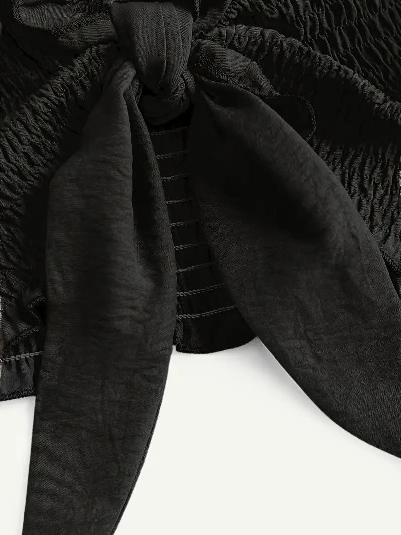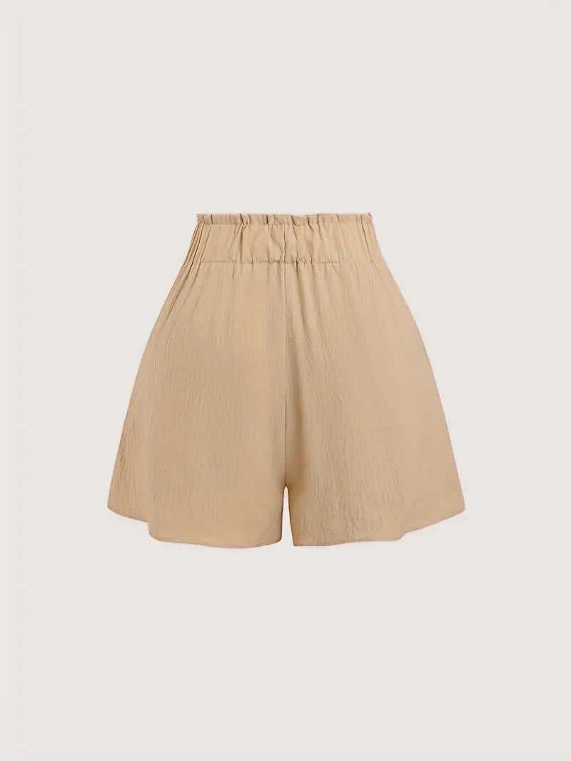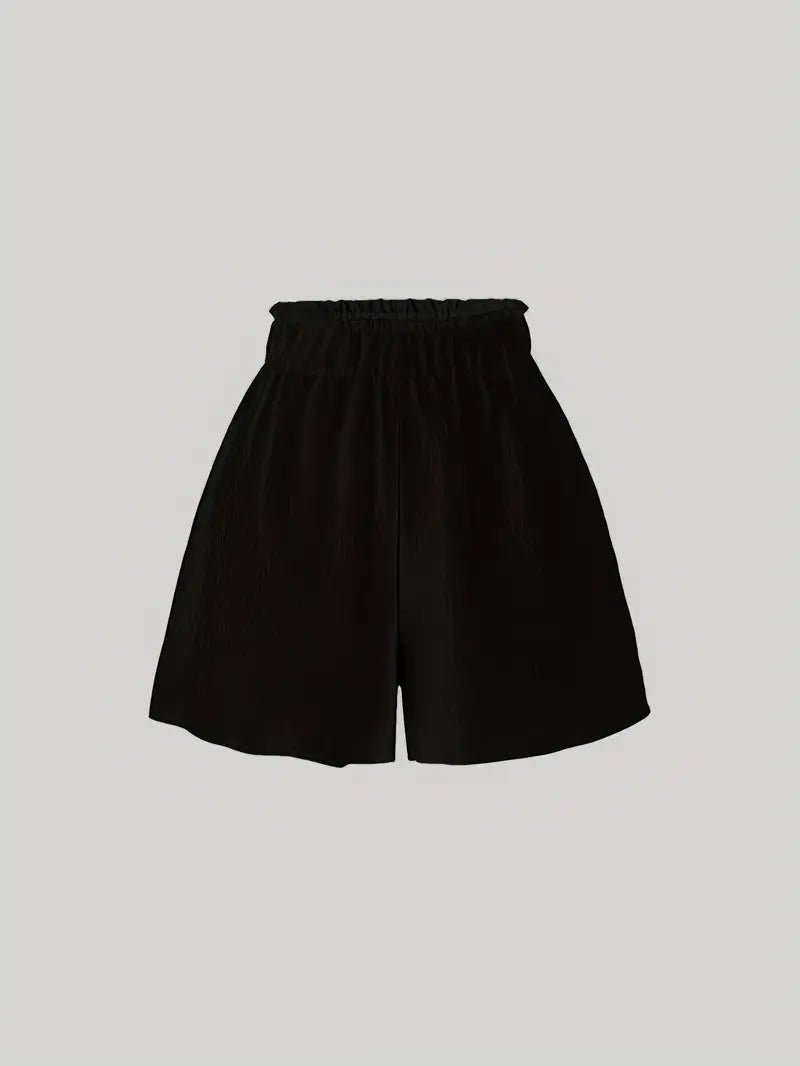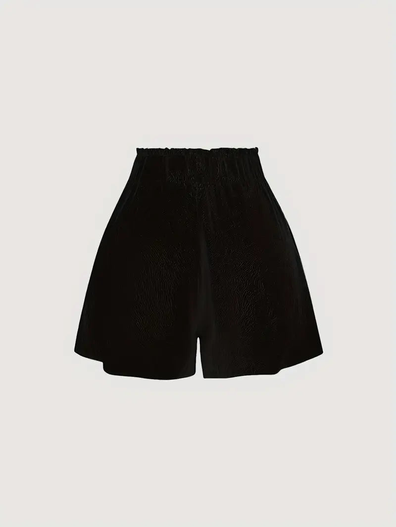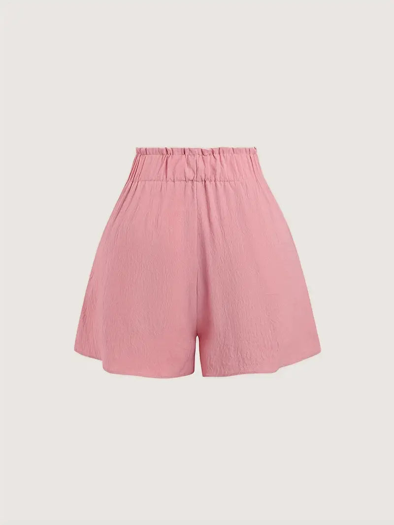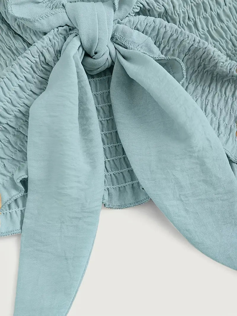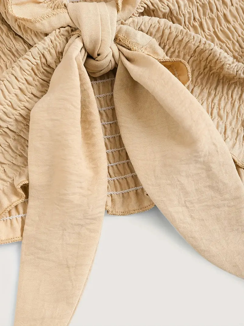 Das Oberteil hat einen trägerlosen Bandeau-Schnitt mit schmeichelhaften Rüschen und einer dramatischen Schleife auf der Vorderseite, während die Shorts mit einem dehnbaren , elastischen Bund für Leichtigkeit und Komfort sorgen. Der Stoff hat ein leicht mattes Finish, das den lässigen und doch polierten Look des Kleidungsstücks unterstreicht.