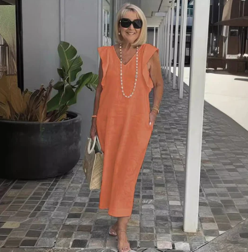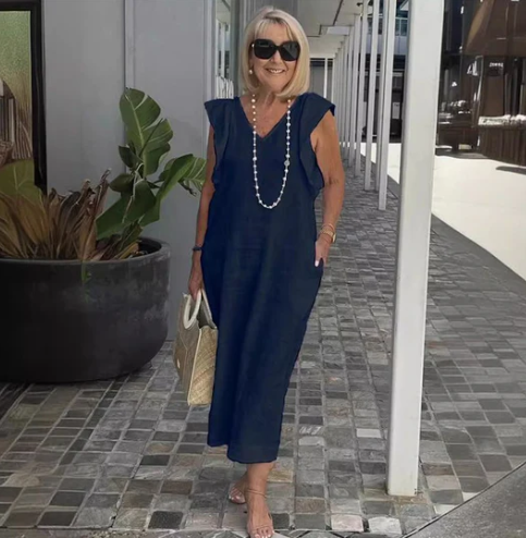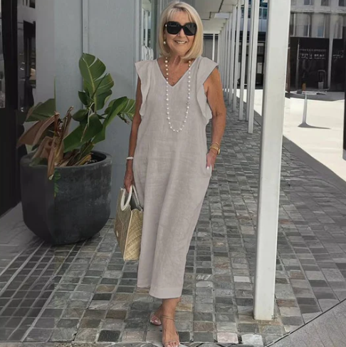 Ein bequemes, lässiges Kleid aus einer Baumwoll-Leinen-Mischung, das idealen Komfort und stilvolle Entspannung bietet.
