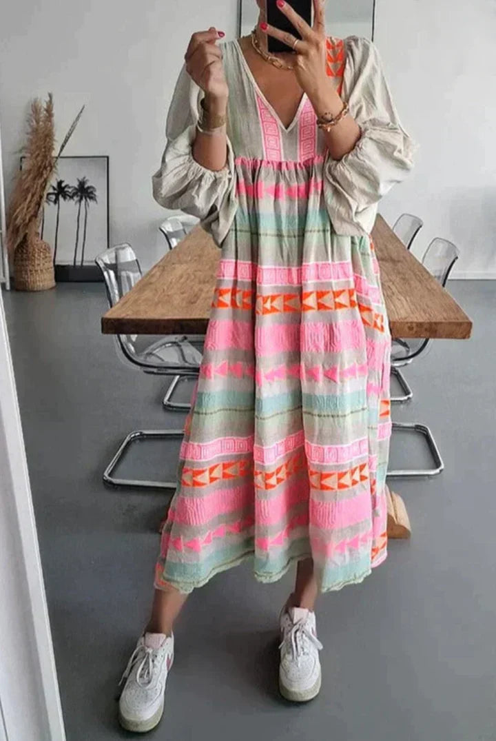 Verschönern Sie Ihre Sommergarderobe mit dem atemberaubenden Luisa Maxikleid. Mit seinem auffälligen und lebendigen geometrischen Muster verbindet dieses Kleid mühelos modernes Design mit zeitloser Eleganz. Aus weichem, atmungsaktivem Stoff gefertigt, bietet es ganztägigen Tragekomfort und setzt bei jedem Anlass ein Statement. Die fließende Silhouette und die schmeichelnde Passform kreieren eine feminine Form, während die lebendigen Farben und der dynamische Druck Ihrem Look einen auffälligen Akzent verleihen.