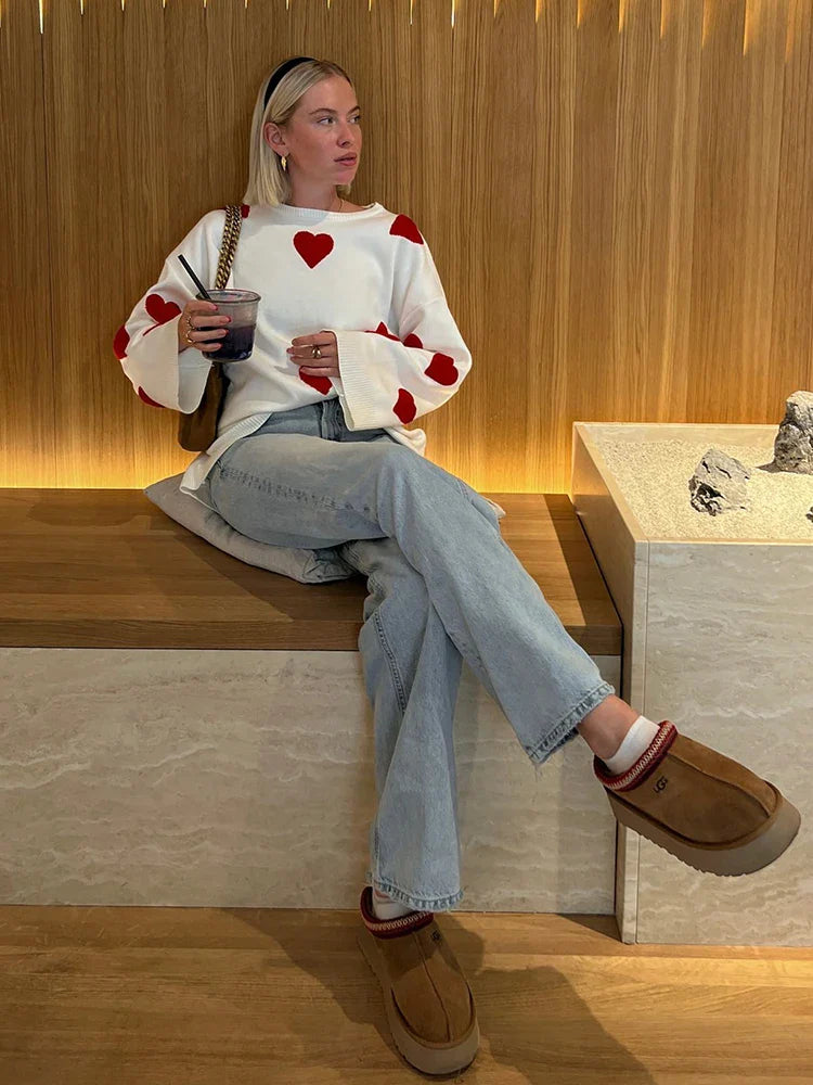 Dieser strickpullover mit herz-muster verbindet cozy vibes mit modernem streetstyle. die weiche maschenqualität fühlt sich angenehm an und fällt lässig. perfekter alltagspartner für denim, wide-leg-hosen und sneaker – einfach anziehen und wohlfühlen.