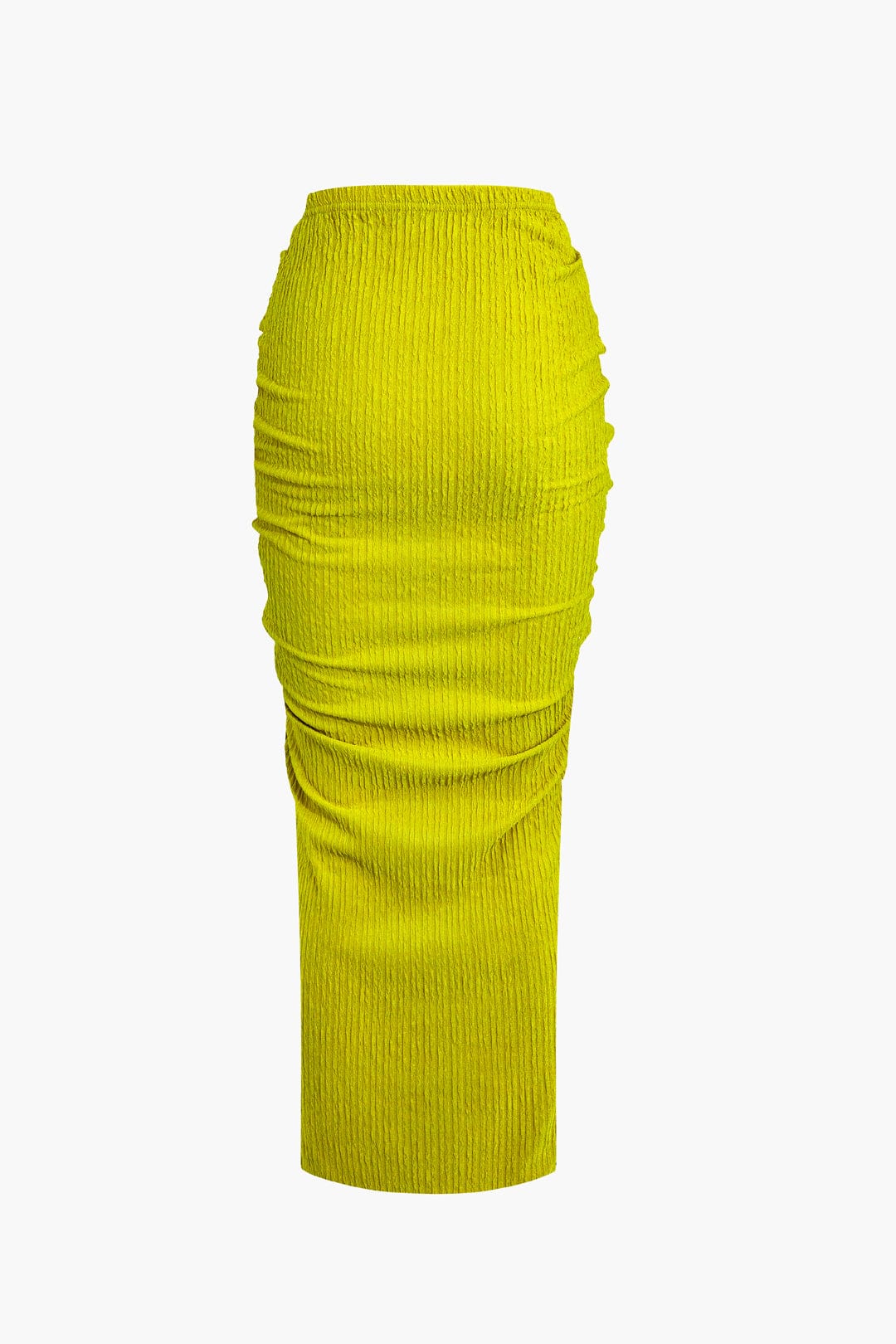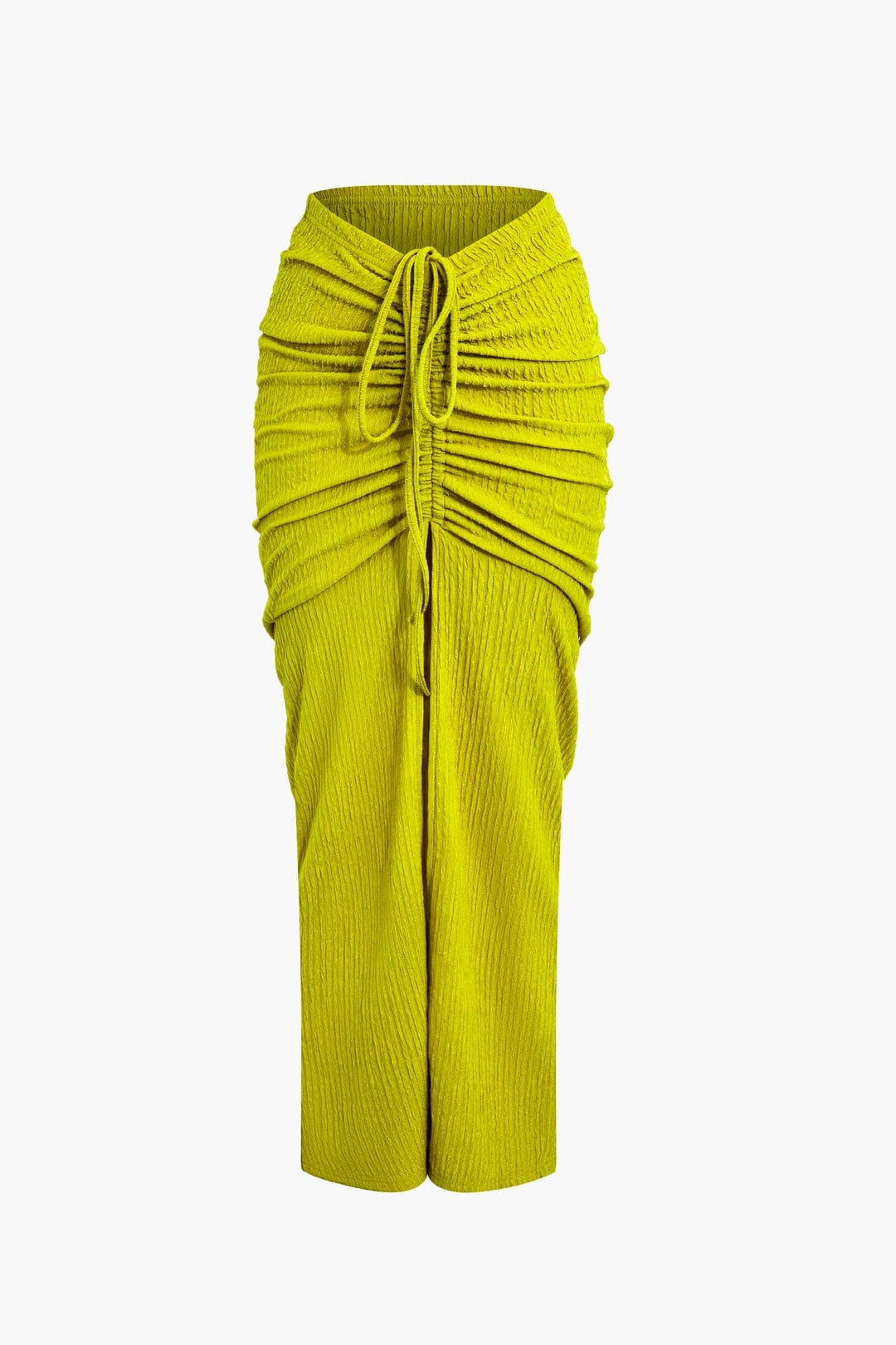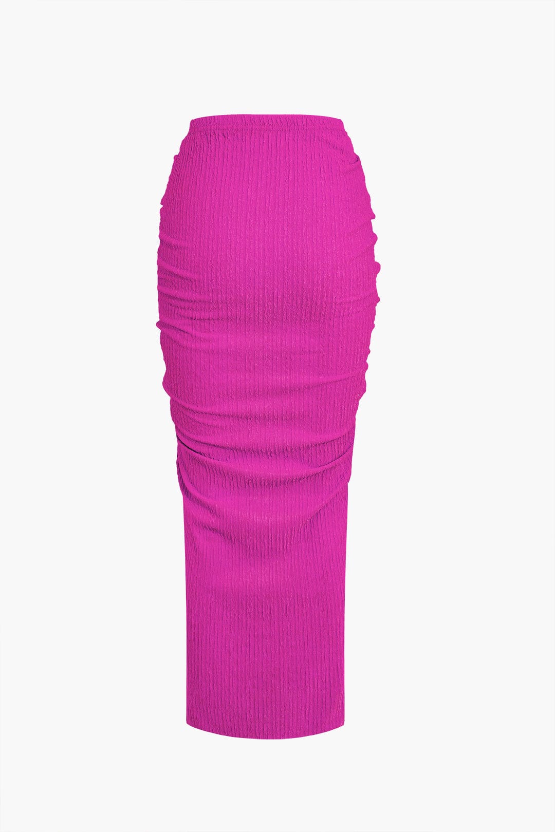 Das Maya Set kombiniert einen klassischen Rundhals-Crop-Top mit einem eleganten, gerafften Rock für einen trendigen und femininen Look. Der geraffte Bund mit Kordelzug betont die Taille und sorgt für eine schmeichelhafte Passform. Perfekt für Sommerpartys, City-Trips oder entspannte Abende.