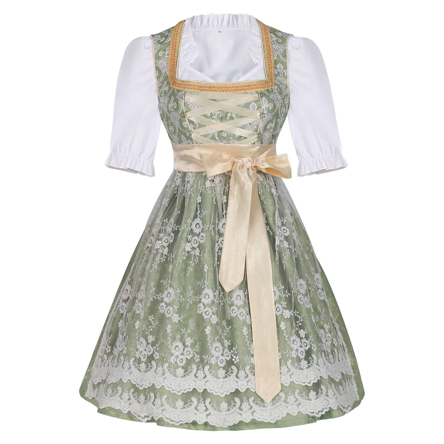 Dieses edle Oktoberfest Dirndl Kleid für Damen kombiniert klassische Trachtentradition mit einem modernen, femininen Look. Das Dirndl besticht durch ein zartes Grün mit floraler Spitzenapplikation, eine goldfarbene Schleife und eine elegante weiße Bluse mit Puffärmeln.
