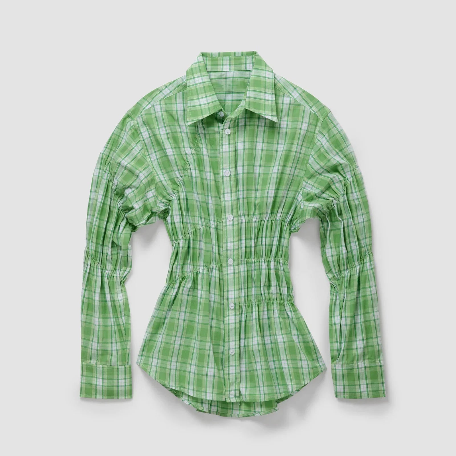 Diese außergewöhnliche Bluse ist ein stilvolles Statement-Piece für modebewusste Frauen. Mit ihrer raffinierten Raffung entlang der Taille und der Ärmel schafft sie eine wunderschön geformte Silhouette und verleiht dem klassischen Hemdblusenstil ein modisches Update. Die strukturierte Linienführung sorgt für Eleganz und Modernität zugleich.