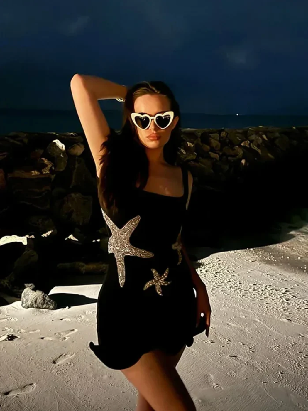 Dieses auffällige Minikleid ist aus einem glatten, dehnbaren Stoff gefertigt, der sich dem Körper anschmiegt und eine schmeichelhafte, figurbetonte Passform bietet. Es ist mit schimmernden Seestern-Applikationen aus Pailletten verziert und bietet eine gewagte, vom Strand inspirierte Ästhetik, die perfekt für Urlaubsnächte ist.