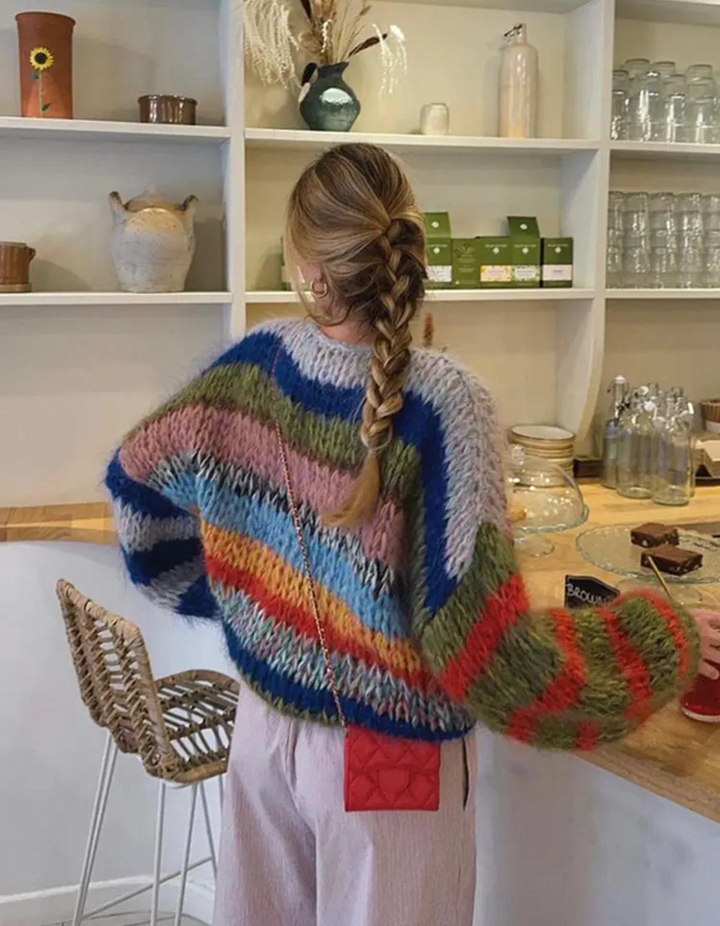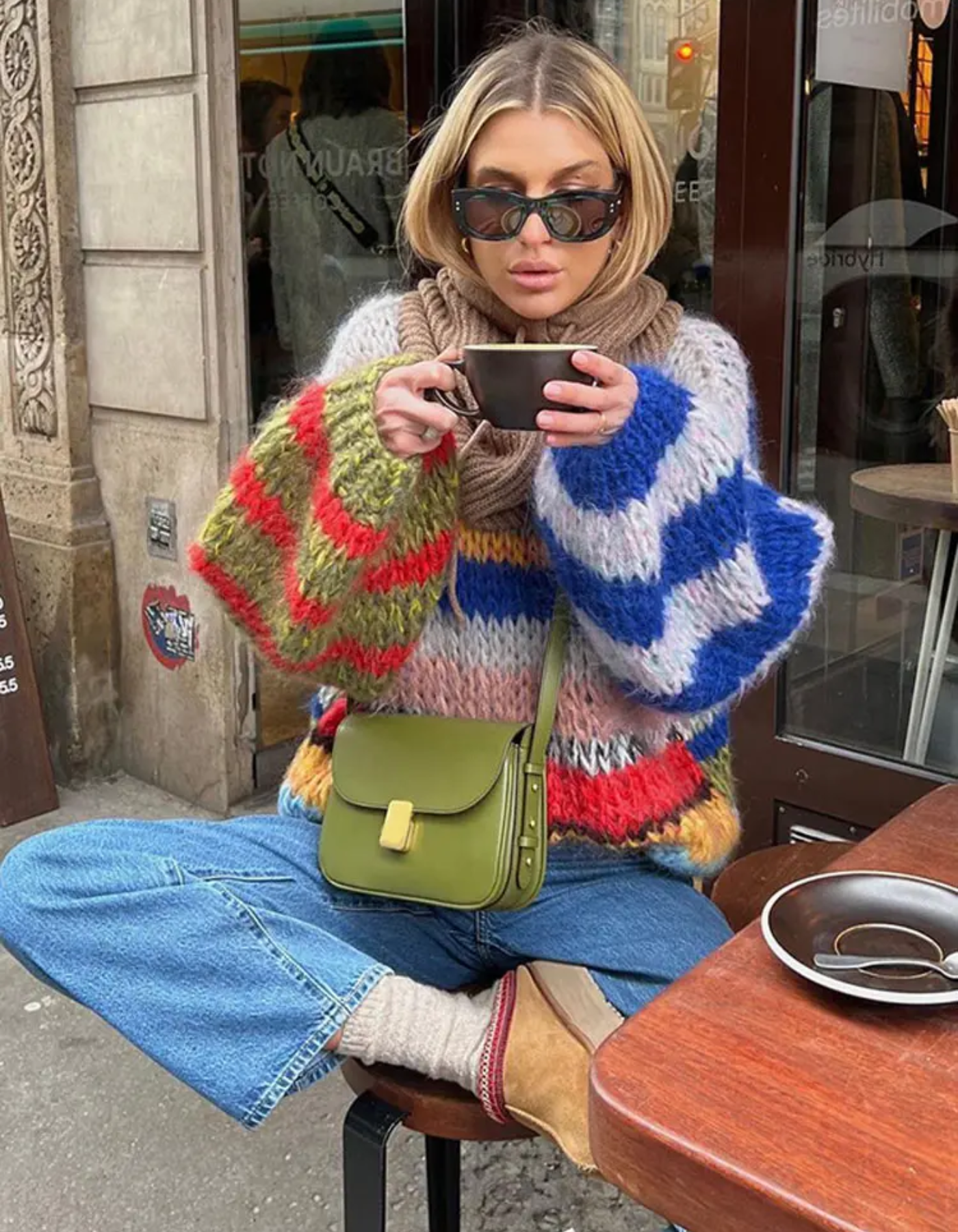 Auffälliges Design: Das grobe Strickmuster und die oversized Passform schaffen eine moderne und entspannte Ästhetik.